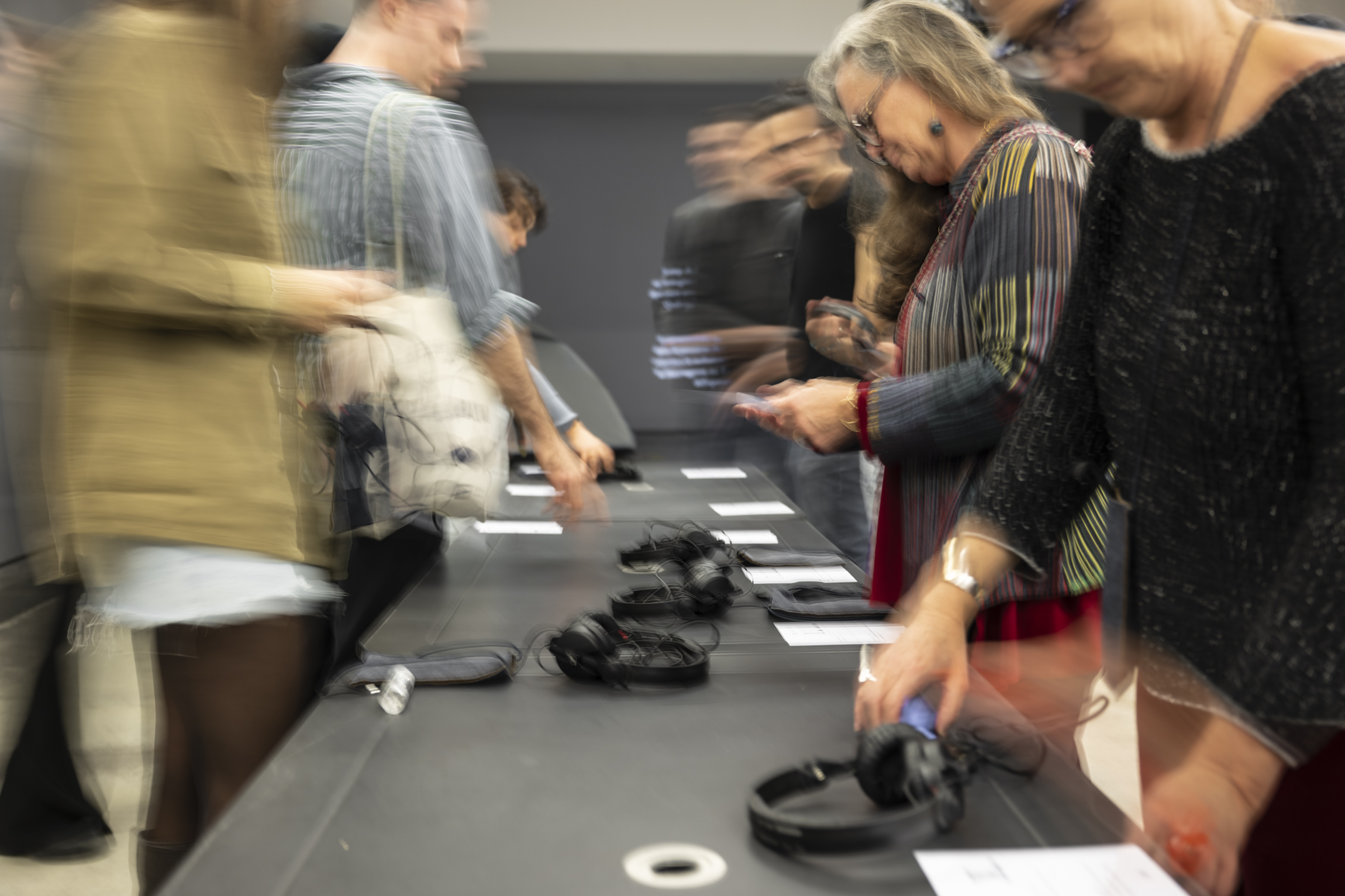 The work is made of several audio tracks that can adapt to different kinds of space, leading to different trajectories in which people their own individual journey, but also interact with others through encounters and gazes.