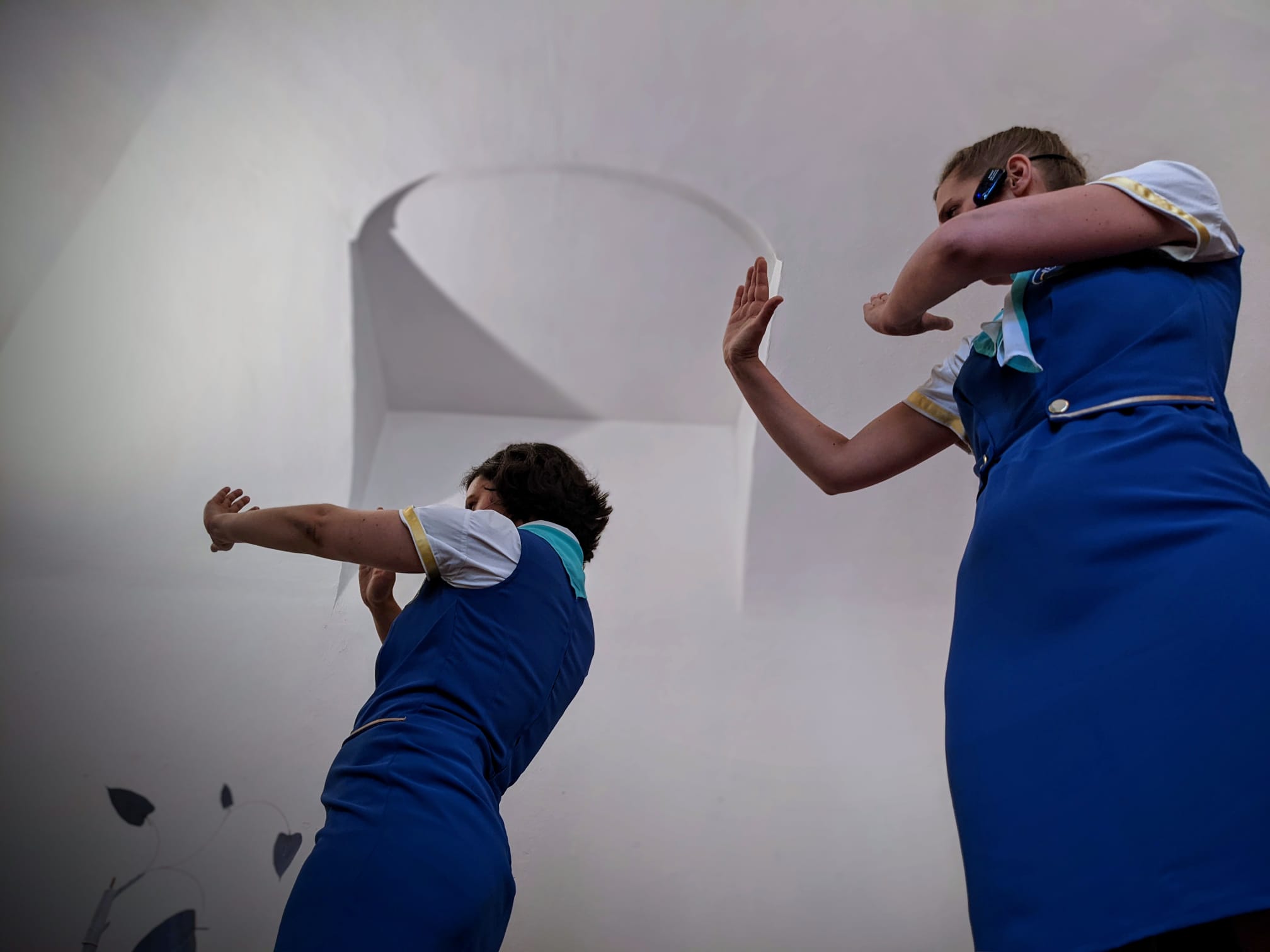 The work is a choreography of text, gestures, LIS signs (Italian sign language), and sound performed by two flight attendants. The stage and the view is a composition of sculptural elements. Cook and researcher of wild plants ecologies Eleonora Matarrese participated by preparing a special menù of appetizers and syrups made of Reynoutria Japonica.